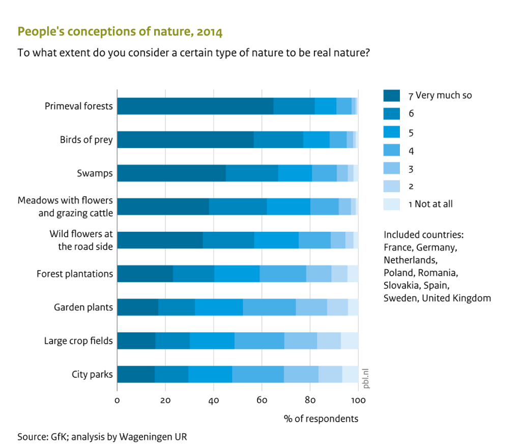 Volgens een recente enquête hebben Europeanen een breed natuurbeeld. Voor hen valt daar van alles onder: van oerbossen, roofvogels en moerassen, tot productiebossen, tuinplanten en grote akkers. Stadsparken scoorden het laagst op de ‘natuurlijkheid’-rangorde, hoewel de helft van alle respondenten deze nog steeds in meer of minder mate als natuurlijk beschouwt. Kortom, voor de meeste mensen is de natuur bijna overal aanwezig. De enquête is gehouden in 9 EU Lidstaten: Nederland, Duitsland, Frankrijk, Polen, Roemenië, Slowakije, Spanje, Verenigd Koninkrijk en Zweden.