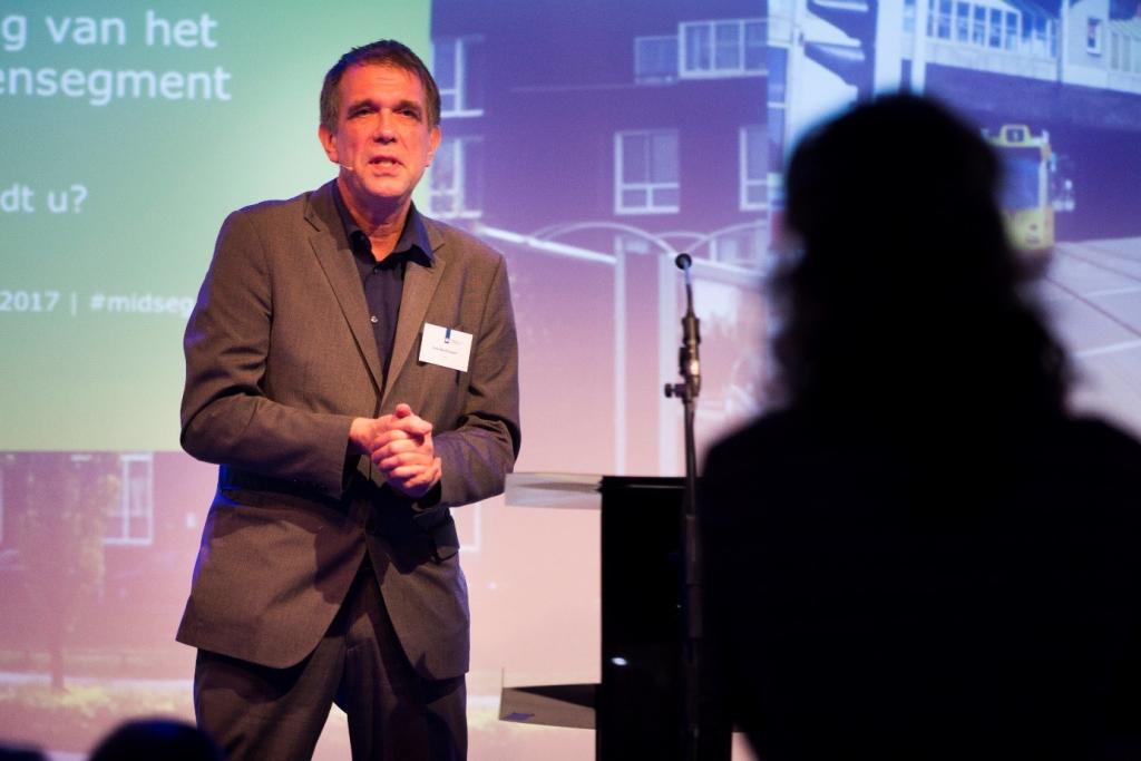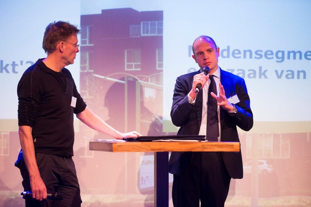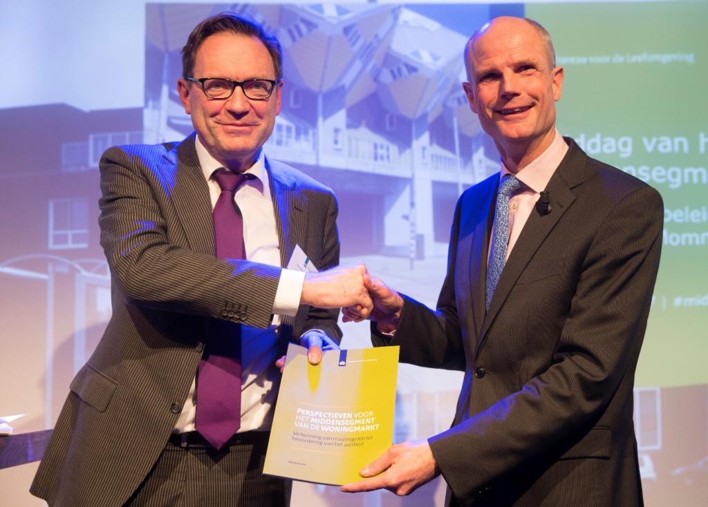 Tijdens de Middag van het Middensegment op 23 januari 2017 in Utrecht presenteerde het Planbureau voor de Leefomgeving de studie ’Perspectieven voor het middensegment van de woningmarkt‘. In het debat over deze huurwoningen zonder staatsteun bleken de voorkeuren voor de verschillende perspectieven sterk uiteen te lopen. Geen twee regio’s zijn hetzelfde en de publieke en private belangen zijn groot. Aan het eind van de middag ontving minister voor wonen Stef Blok het eerste exemplaar van de studie uit handen van PBL-directeur Hans Mommaas.
