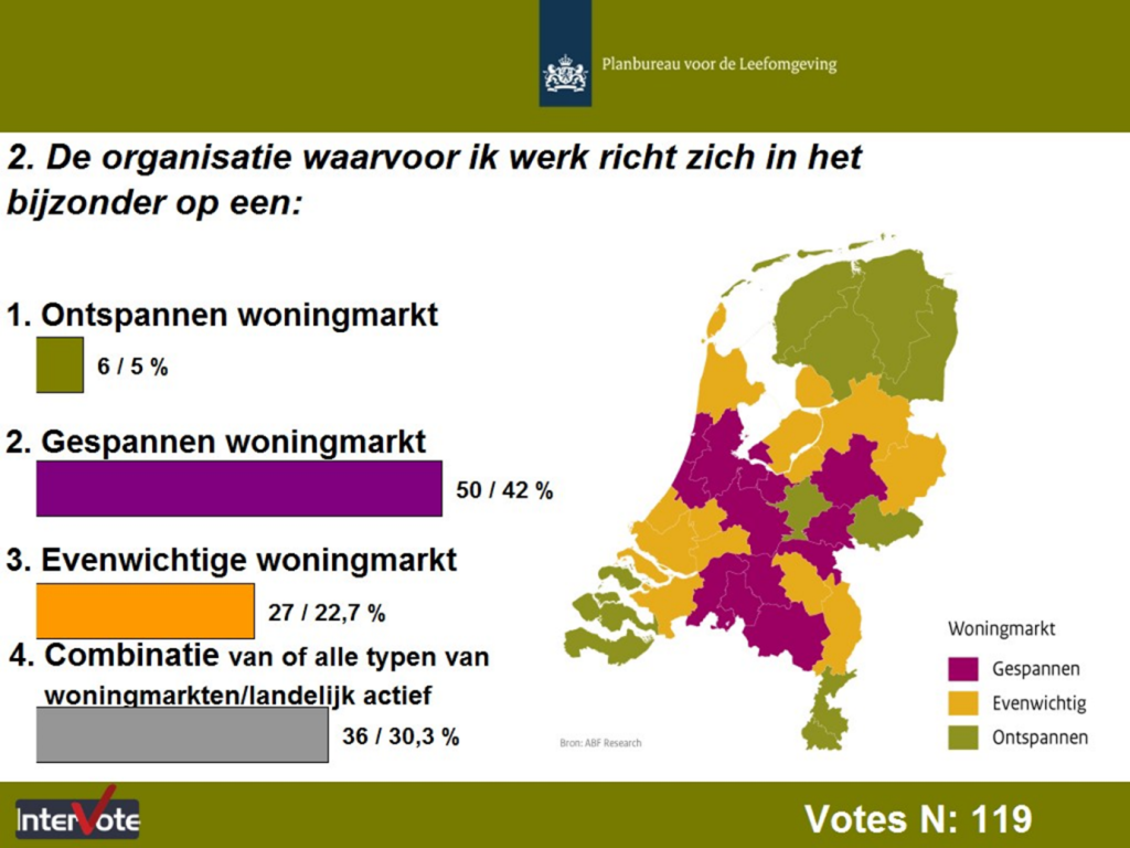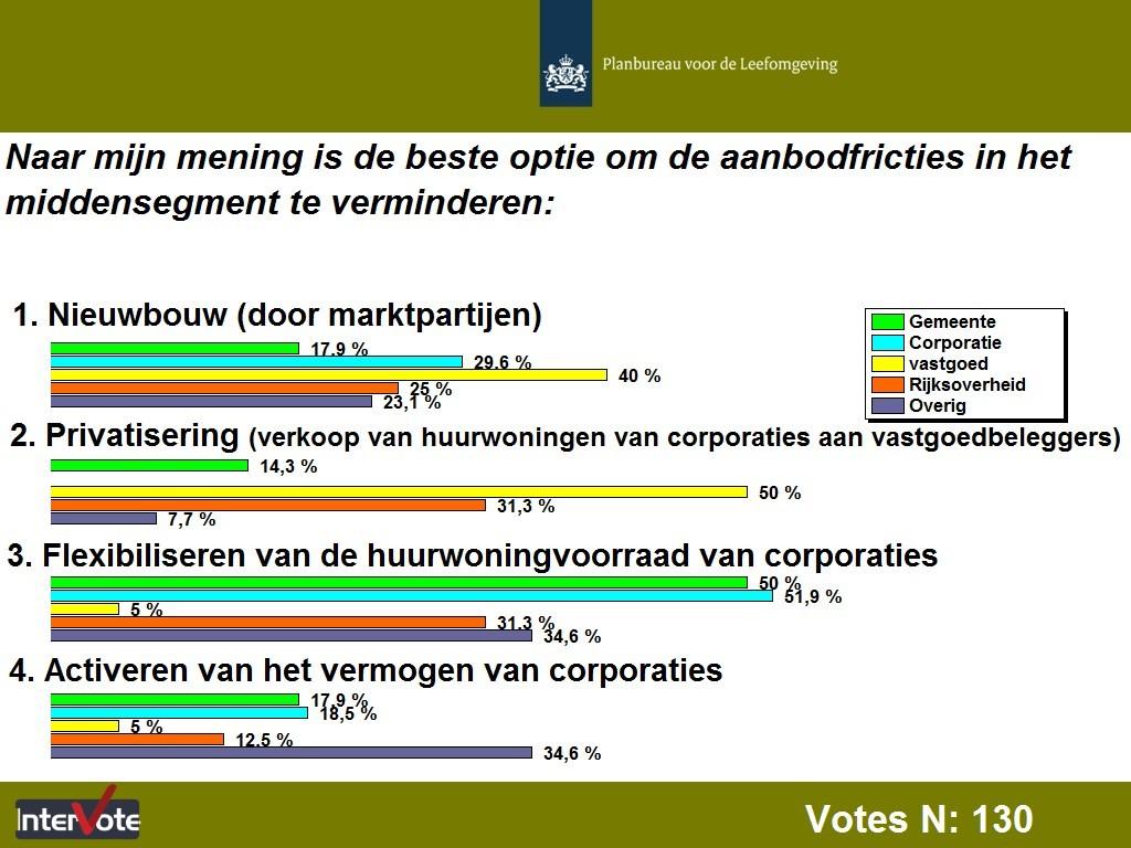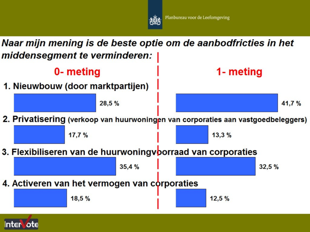 Een eerste peiling over de vier denkrichtingen tijdens de Middag voor het Middensegment laat een brede spreiding zien. Ongeveer 18 procent van de aanwezigen heeft een voorkeur voor de denkrichtingen privatiseren respectievelijk activeren, bijna 29 procent voor nieuwbouw en 35 procent voor flexibiliseren. Vastgoedbeleggers hebben een sterkere voorkeur voor privatiseren en nieuwbouw, gemeenten en corporaties zien meer in flexibiliseren; de aanwezige rijksoverheid laat een sterke spreiding zien en de overige aanwezigen, waaronder diverse huurders, hebben een iets sterkere voorkeur voor activeren. “Dit is een goede denkrichting want er kan geïnvesteerd worden terwijl er toch nog een maatschappelijk draagvlak onder kan blijven”, motiveert een van hen zijn keuze.
