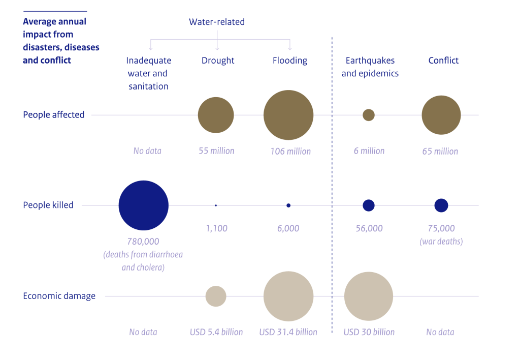 Droogte, overstromingen en slechte sanitaire voorzieningen zorgen voor de grootste watergerelateerde uitdagingen. Vooral het gebrek aan sanitaire voorzieningen (riolering en drinkwatervoorziening) treft jaarlijks een groot deel van de wereldbevolking. Naar verwachting hebben in 2050 ruim 2 miljard mensen nog onvoldoende sanitaire voorzieningen, wat leidt tot veel ziektes en overlijden. Door een combinatie van een sterke bevolkingsgroei, een toenemend tekort aan water en een laag inkomen per hoofd van de bevolking, zou Afrika een hotspotgebied kunnen worden voor migratie en mogelijk ook voor water-gerelateerde conflicten. Verder kunnen de 3700 nieuw geplande dammen voor waterkrachtcentrales in combinatie met de toenemende watervraag tot groeiende spanningen leiden in grensoverschrijdende rivierstroomgebieden.