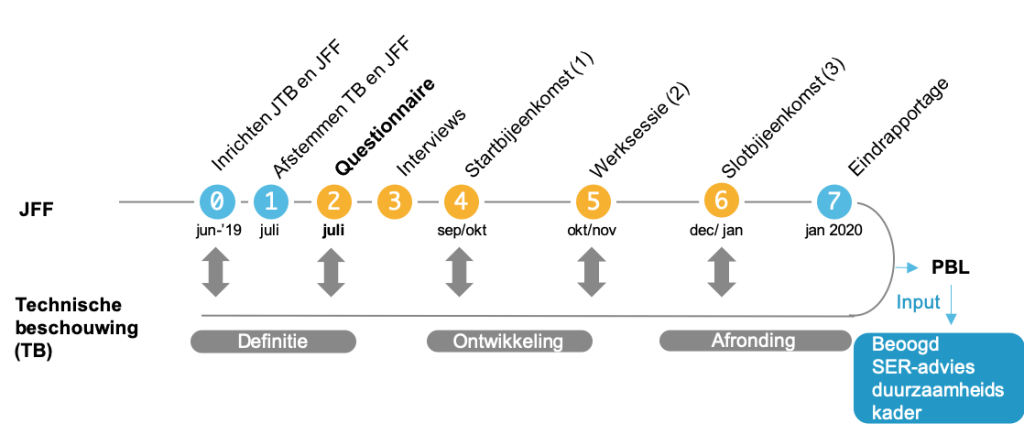 De uitvoering van het eerste spoor, de JFF met stakeholders, wordt begeleid door MSG-strategies samen met De Gemeynt. De cijfermatige of technische beschouwing wordt uitgevoerd door CE-Delft die daarbij wordt bijgestaan door Royal Haskoning DHV. De projectleiding ligt bij het PBL, dat ook de eindverantwoordelijkheid heeft. Royal Haskoning is tevens de partij die de studie zal uitvoeren naar duurzaamheidscriteria (punt 3 zoals benoemd in de inleiding). Dit is een project dat organisatorisch los staat van de biomassastudie van PBL, maar uiteraard wel gebruik maakt van de (tussen)resultaten daarvan. Het JFF-traject start met een questionnaire die wordt gestuurd naar een kleine 200 stakeholders. Tevens worden er verdiepende interviews gehouden met ongeveer 40 personen. De antwoorden op de questionnaire en de interviews vormen input voor de eerste bijeenkomst met stakeholders die eind september zal plaatsvinden. Eind oktober of begin november volgt dan een JFF-werksessie met een kleinere groep stakeholders en experts. Als input voor deze sessie zullen de eerste tussenresultaten van het tweede spoor worden gepresenteerd, inclusief het genoemde schuivenmodel. Voor het kerstreces of kort daarna zal een afsluitende bijeenkomst plaatsvinden, waarna eind januari 2020 het eindrapport opgeleverd zal worden (Update: inmiddels is de publicatiedatum verschoven naar begin mei 2020).