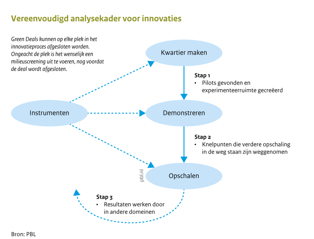 Uit eerdere evaluaties is gebleken dat meestal onduidelijk blijft in hoeverre de Green Deals leiden tot positieve effecten op economie en milieu. Recent heeft het PBL daarom voor twee domeinen de potentiële milieuwinst die met Green Deals bereikt kan worden onder de loep genomen. Het gaat om deals op de thema’s ‘Circulaire Economie’ en ‘Biodiversiteit’. Dat laatste onderzoek is in samenwerking met de WUR (Alterra) uitgevoerd. Algemeen uitgangspunt voor de PBL-studies is een analysekader voor het verloop van innovaties. Vanuit een lineair perspectief doorlopen innovaties na een fase van ‘onderzoek en ontwikkeling’, de fases ‘kwartier maken’, ‘demonstreren’ en ‘opschalen’.